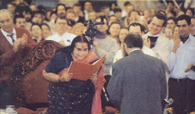 In 1994, France granted official recognition to Sahaja Yoga as a religion. During Her visit to Brasilia in 1994, the Mayor received Her at the aircraft and presented Her the keys to the city. Ecoforum in Bulgaria awarded Her with a Gold Medal in August 1995 and the same year the Romanian University conferred upon Her a doctorate in Cognitive Science. In September 1995, Shri Mataji was an official guest of the Chinese government and addressed the World Women's Congress in Beijing.